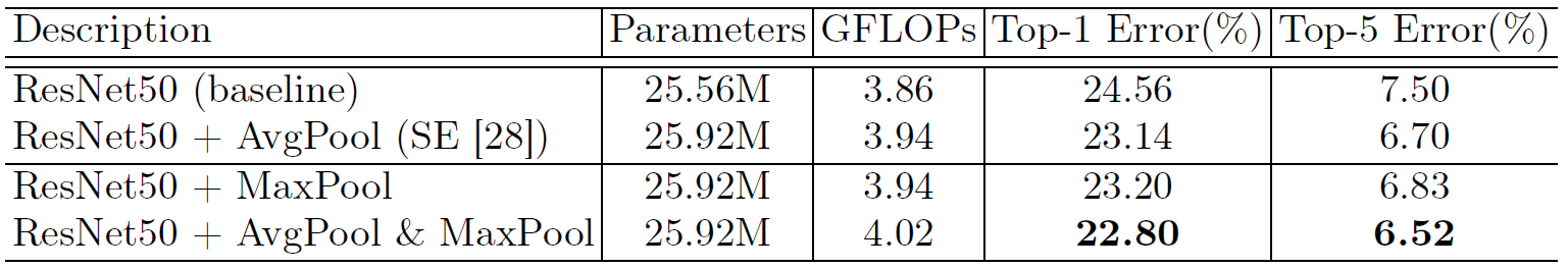 本文首先利用ImageNet分类任务来验证了同时使用特征图的全局最大池化及平均池化对性能的影响,最终的实验结果如表1所示。从表中可以看出同时使用最大池化及平均池化能够提高模型的识别精度。