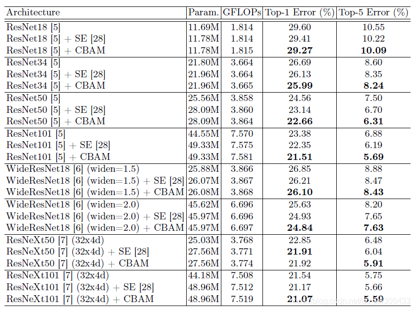本文分别在ImageNet分类任务中对比了基础的ResNet及SENet,可以看出CBAM的有效性。