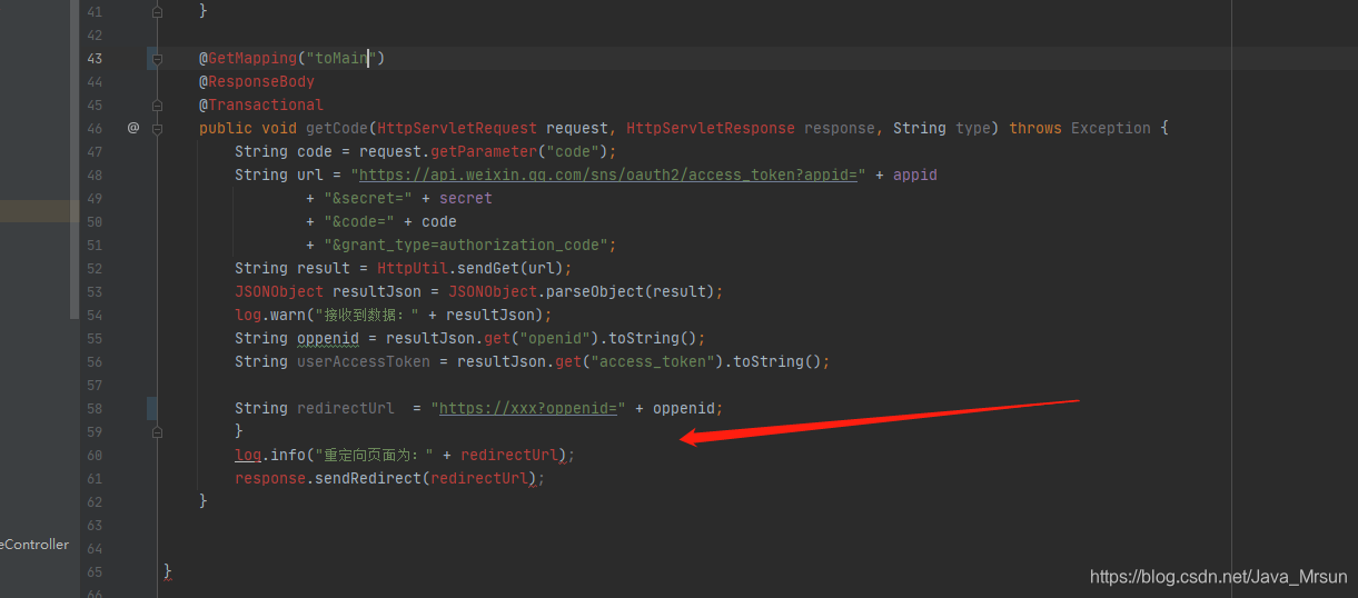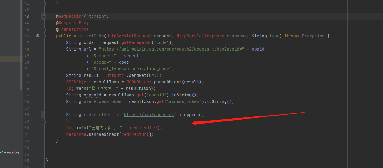 此处是回调方法,可以获得code,用code可获得网页授权access_token,这个access_token可用来获取用户基本信息,废话不多说直接上代码