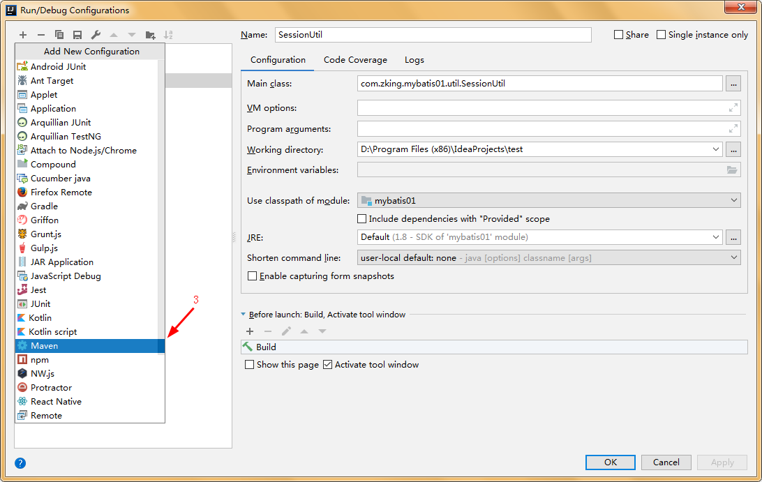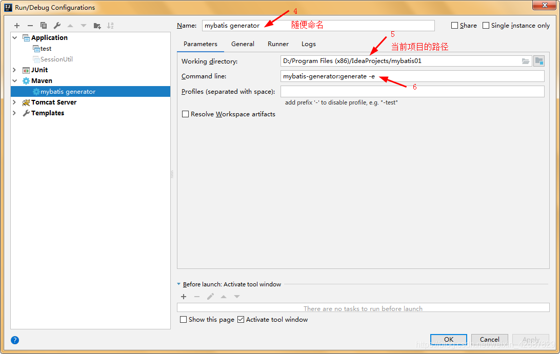</generatorConfiguration>(3)在Intellij IDEA添加一个“Run运行”选项,使用maven运行mybatis-generator-maven-plugin插件,命令:mybatis-generator:generate -e