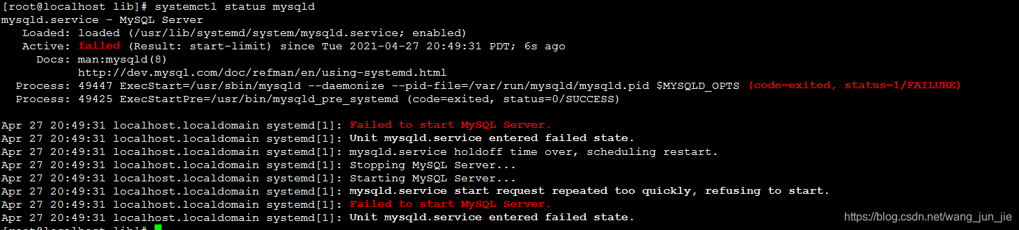 根据启动mysql服务时的提示信息,使用systemctl status mysqld 命令,查看信息