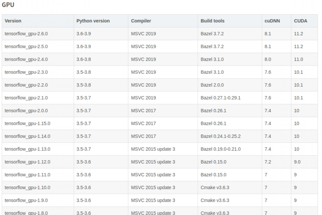安装对应的TensorFlow-GPU版可以查看对应的CUDA、CUDNN版本https://www.tensorflow.org/install/source_windows