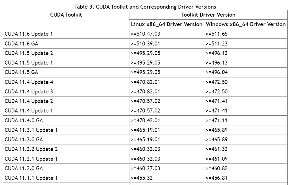 安装CUDA前需要检查自己电脑的NVIDIA版本,然后查找对应的CUDA版本Release Notes :: CUDA Toolkit Documentation