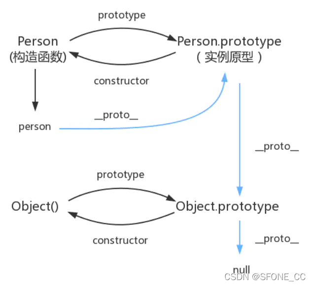 每一个对象数据类型(普通的对象、实例、prototype......)也天生自带一个属性__proto__,属性值是当前实例所属类的原型(prototype)。原型对象中有一个属性constructor, 它指向函数对象。