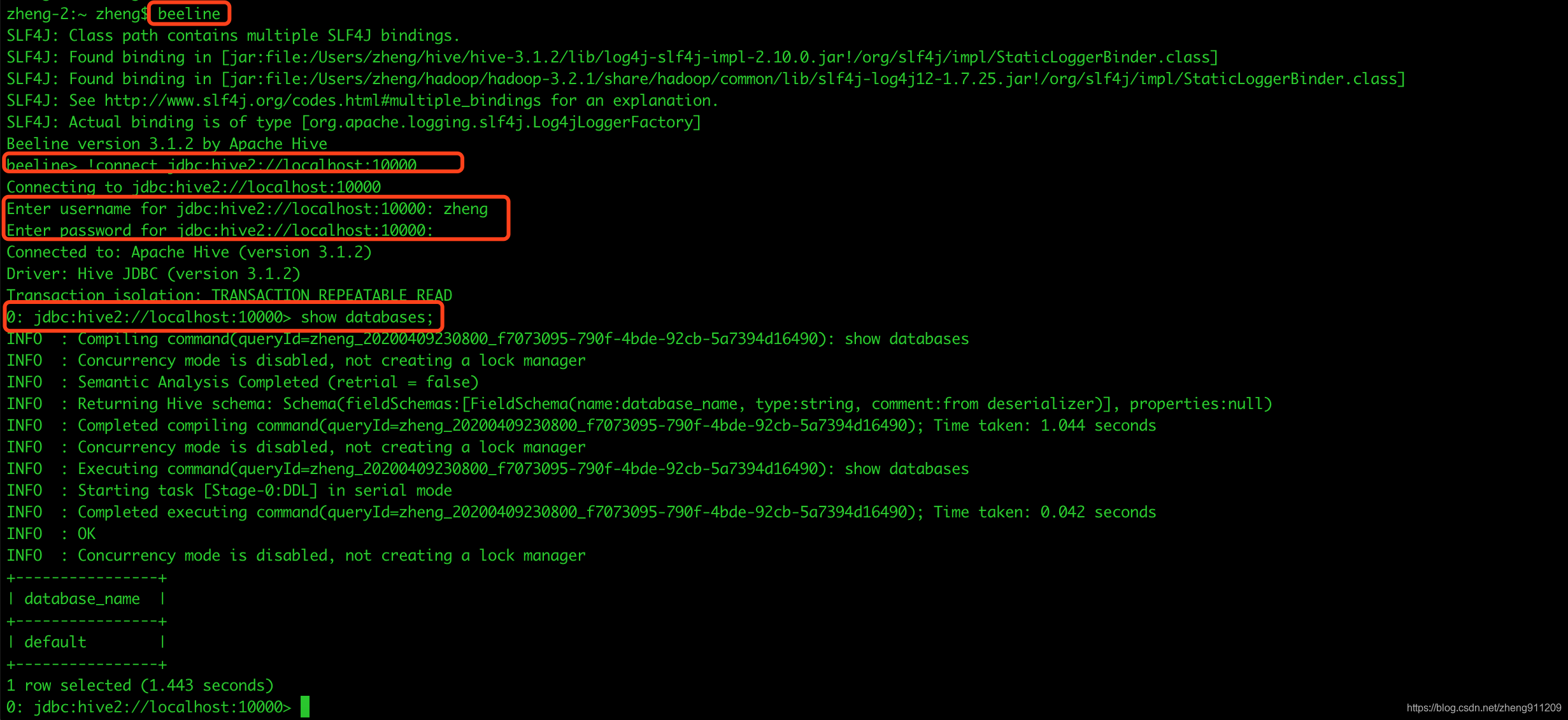 $ Enter username for jdbc:hive2://localhost:10000:zheng