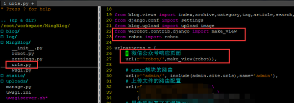在Django中修改url.py文件,将微信客户端的请求指向到robot.py