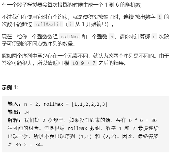 题目链接:https://leetcode-cn.com/problems/dice-roll-simulation/