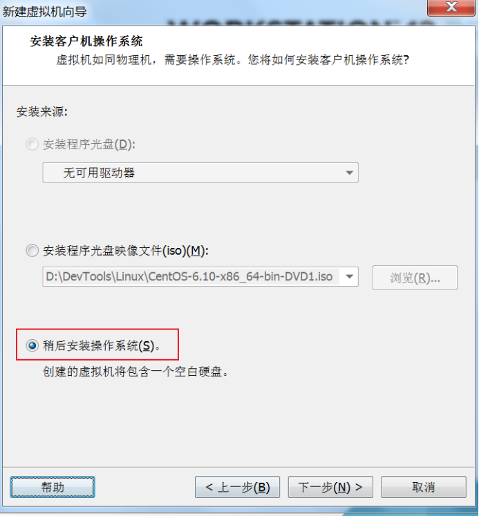 注意:在这里我们选择稍后安装操作系统,这里相当于只是创建一个没有操作系统的虚拟电脑