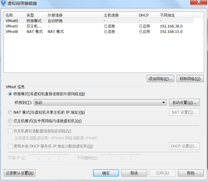 1,桥接模式:默认使用vmnet0的虚拟网卡使用当有电脑路由器的分配的IP地址,也就是使用这种模式之后虚拟器就相 当于当前局域网的一个真正的电脑了