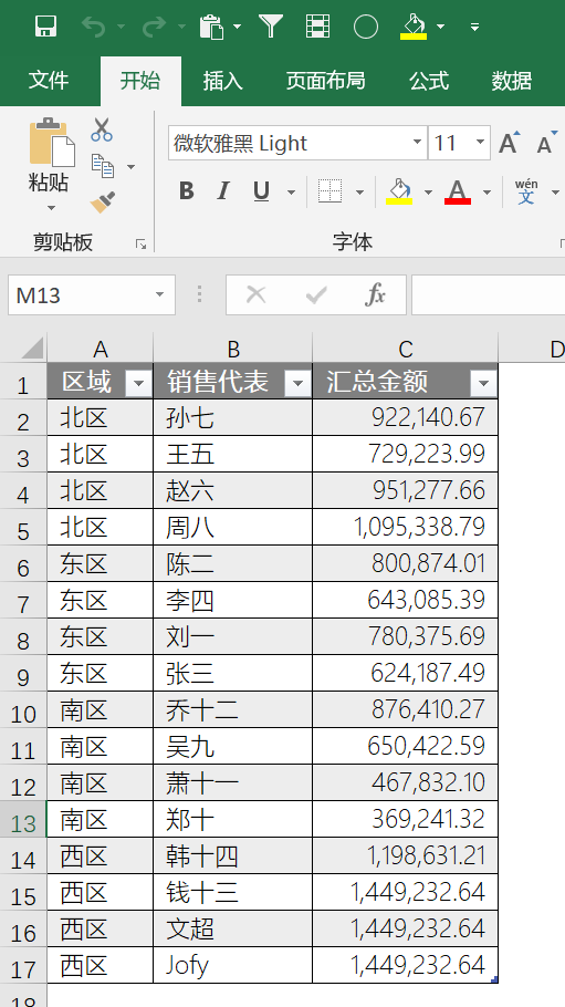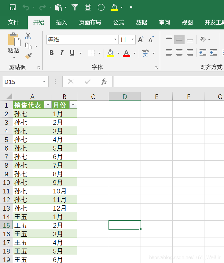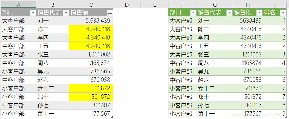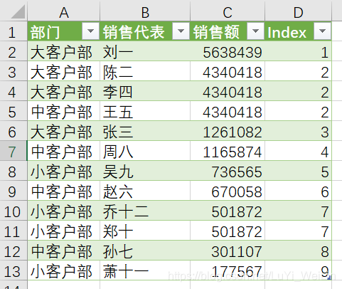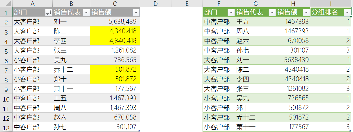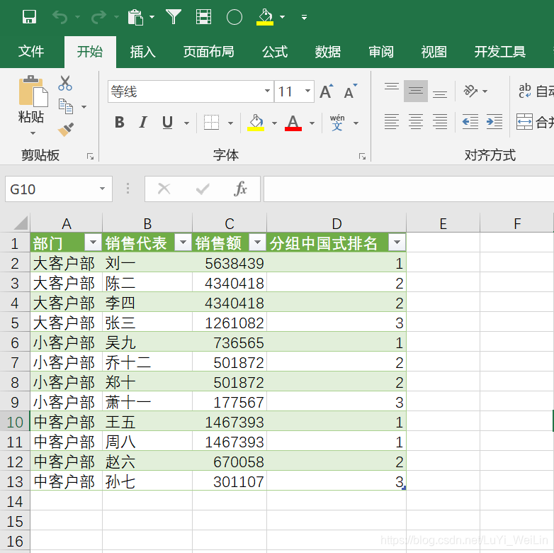 还是同样的表格,但是按照部分类别实现销售代表排名