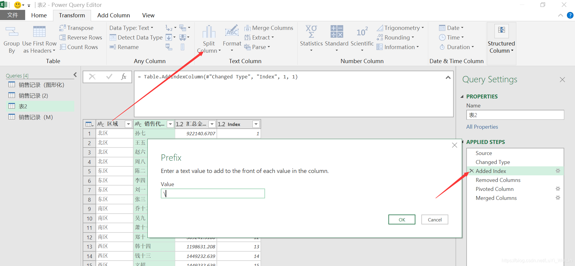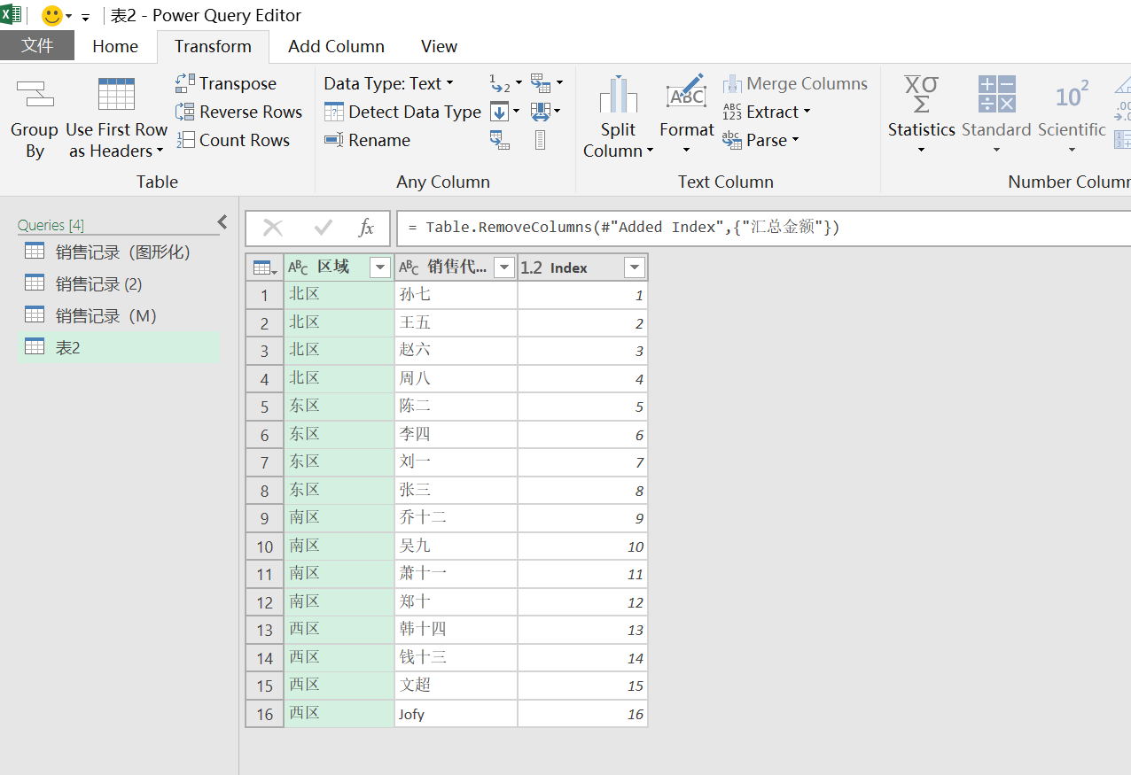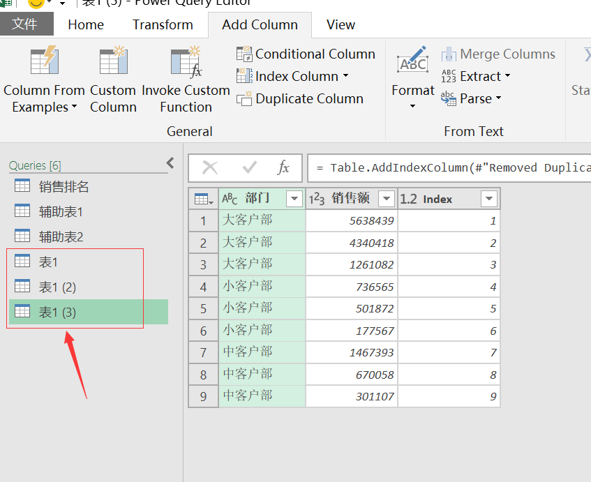 首先我们还是把数据加载进查询编辑器,复制相同的查询,在原始查询中(删除销售金额,添加索引列)得出效果如下