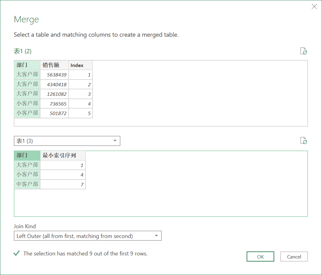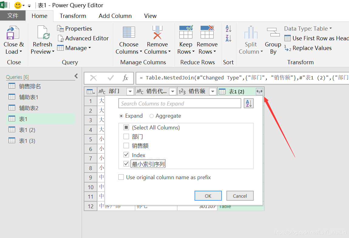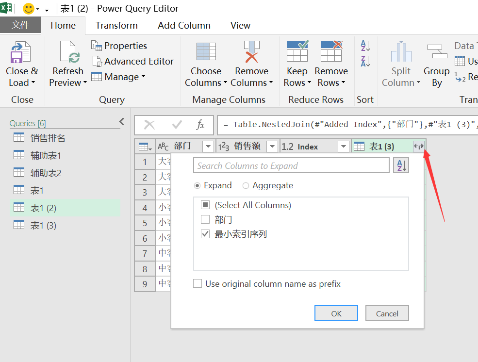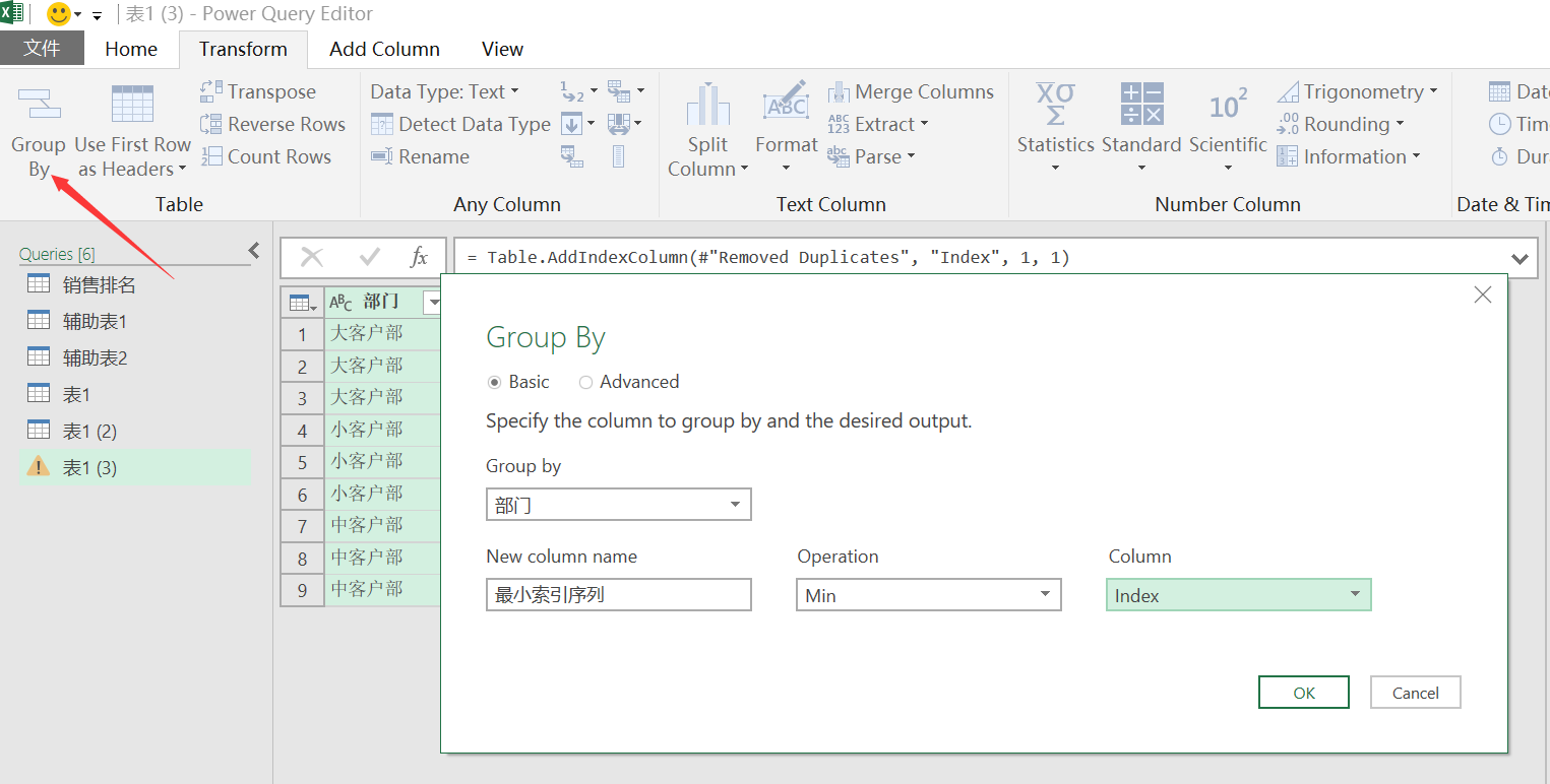 在新复制出来的查询使用分组依据,找出部门类别索引序列的最小值
