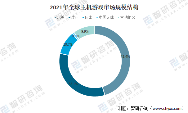 从市场结构来看,2021年北美主机游戏市场规模占全国主机游戏市场规模的45.4%,占比最大;欧洲主机游戏市场规模占全国主机游戏市场规模的33.1%;日本主机游戏市场规模占全国主机游戏市场规模的10.7%;中国大陆主机游戏市场规模占全国主机游戏市场规模的0.9%。