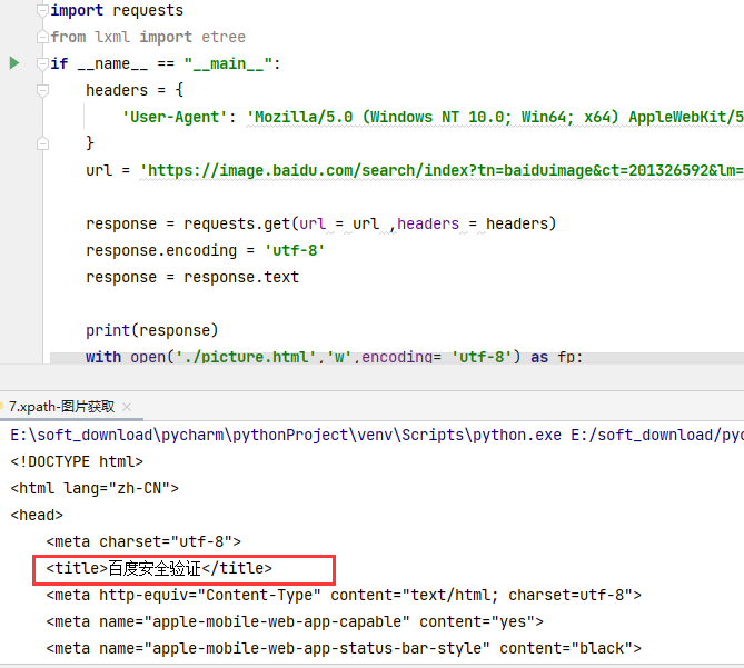 python爬取网页返回响应中出现百度安全验证的解决办法出现下面这种情况时,采取的办法是,将Accept包含的信息也加入headers。 版权声明:本文为weixin_46830352原创文章,遵循CC 4.0 BY-SA版权协议,转载请附上原文出处链接和本声明。原文链接:https://blog.csdn.net/weixin_46830352/article/details/120369277