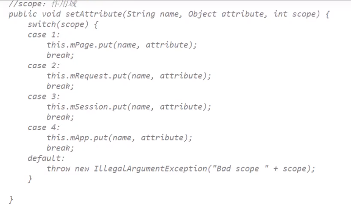 又回到上面那个问题,为什么session和application可以跨页面?其实setAttribute可以有第三个参数,scope作用域。