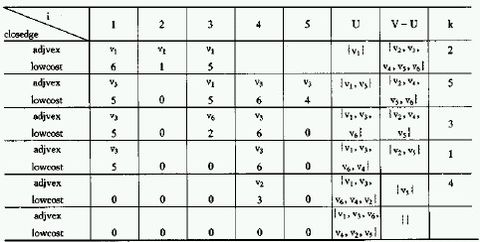 如下所示为构造生成树的过程中,辅助数组中各分量值的变化情况,初始归U={v1},加入到U集合中的节点,我们将lowcost改成0以示: