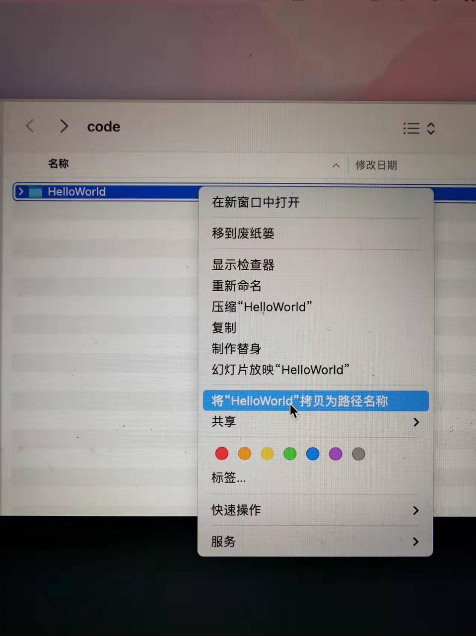 复制文件所在的文件夹路径:按住option键,右击文件夹,点击“将HelloWorld拷贝为路径名称”
