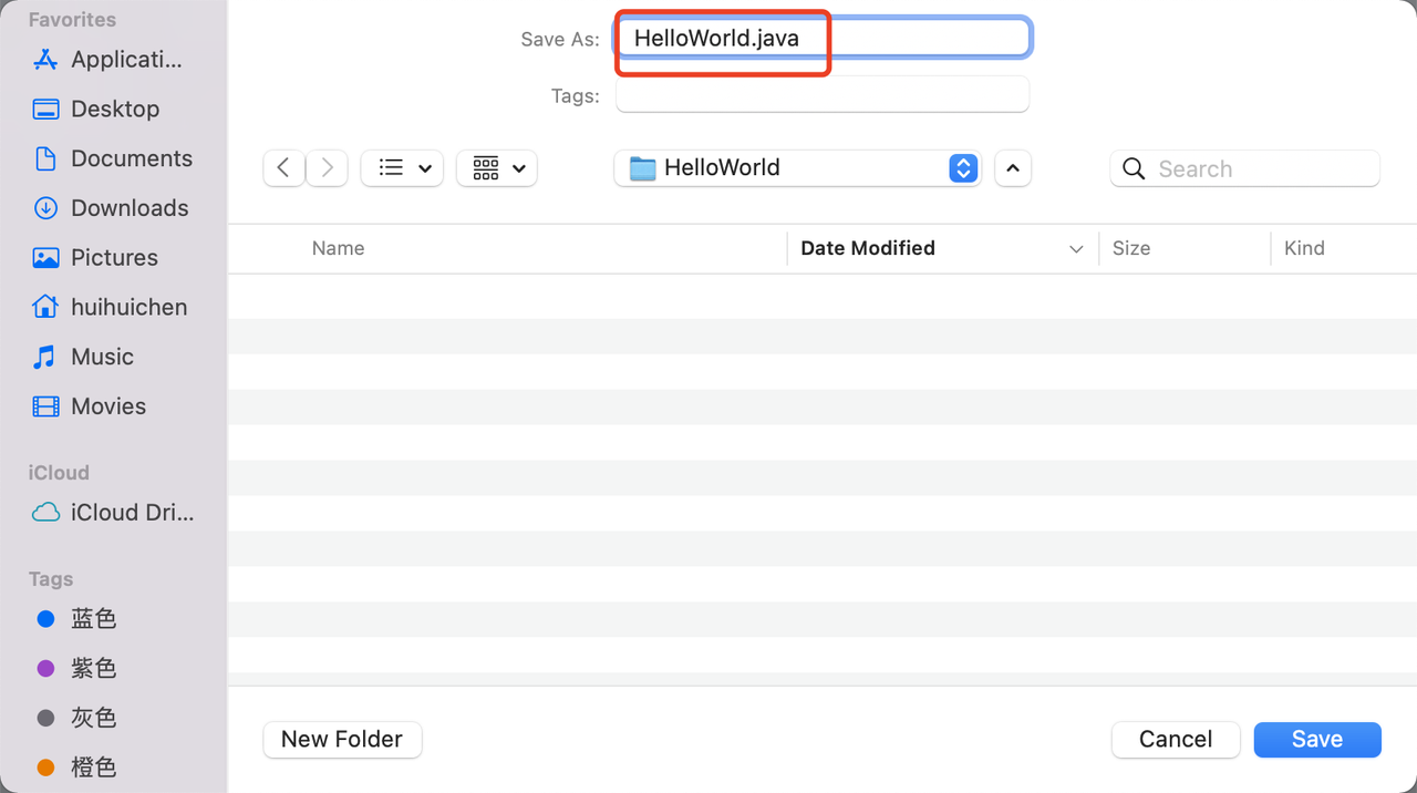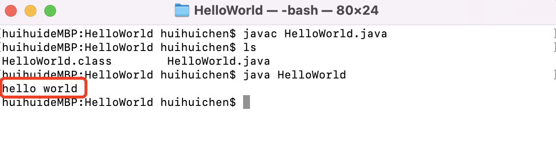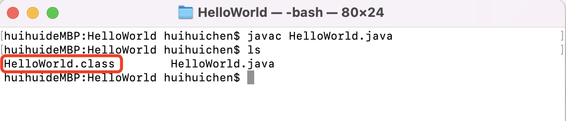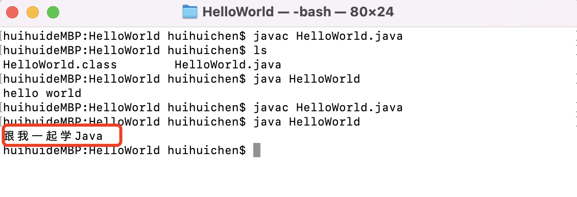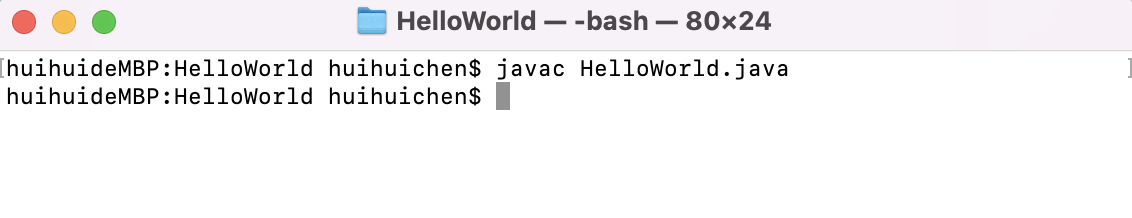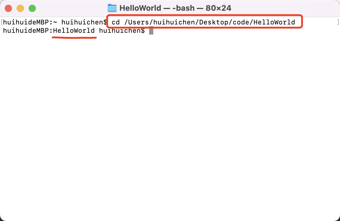 打开终端,定位到.java文件所在的文件夹:输入cd /Users/huihuichen/Desktop/code/HelloWorld (上面复制的路径)