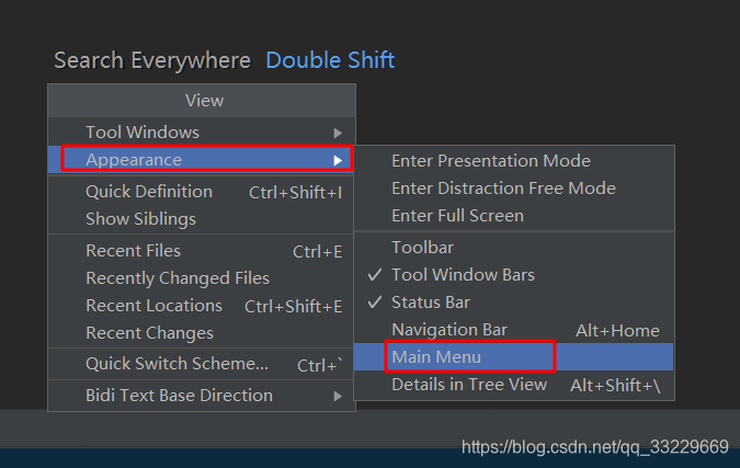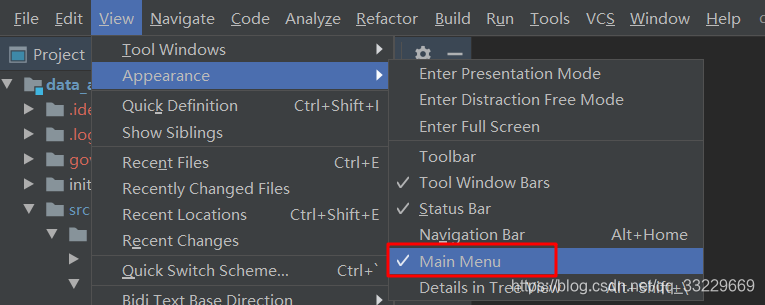 有一天手贱, 把idea中 view下面的Appearance里面的Main Menu 给反选了
