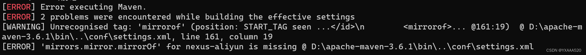 在不久之前,跟同学初学maven,然后大家肯定首先都会配置阿里云镜像仓库嘛,当时就是在网上随便一搜,就直接使用了别人弄好的阿里云镜像仓库配置,并没有认真的查看,但是就在今天,我使用clean的时候,给我报错了,然后我就在cmd窗口执行mvn,发现当初的镜像并没有完全配置好,导致出错: