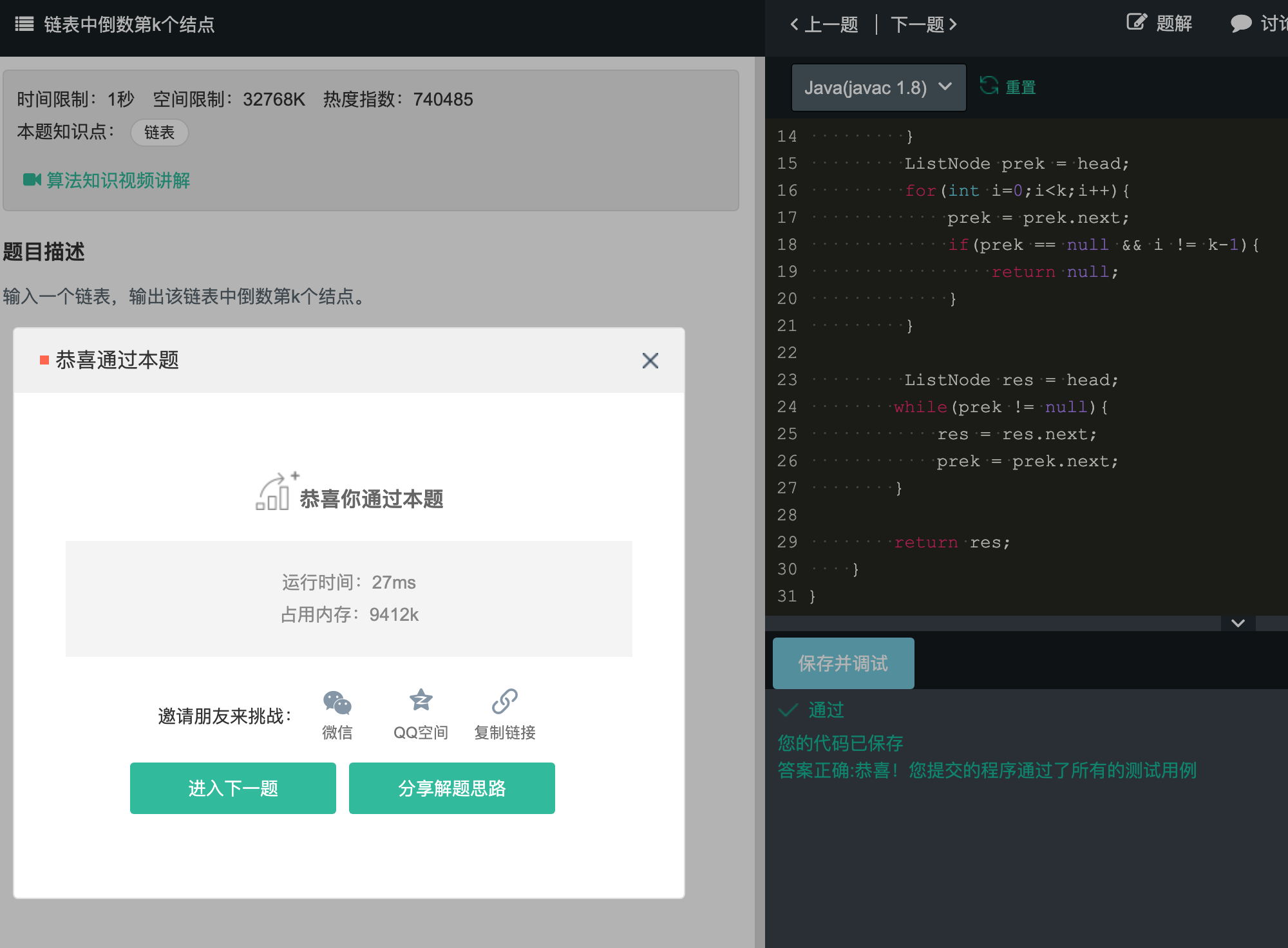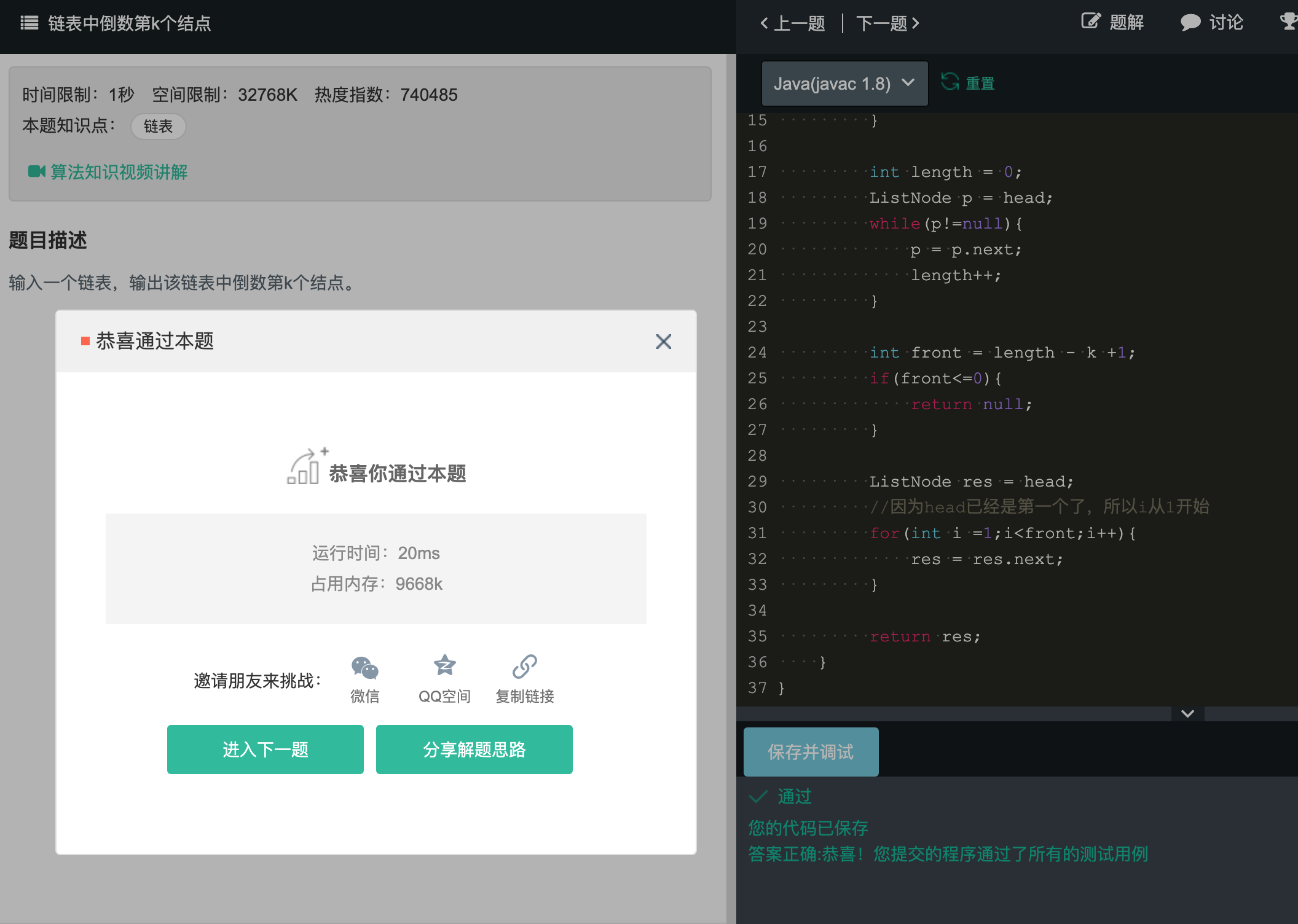 解法2: 使用2个指针,前面的先走k步,然后两指针一起走,