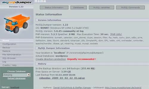 MySQLDumper使用PHP开发的MySQL数据库备份恢复程序,解决了使用PHP进行大数据库备份和恢复的问题,数百兆的数据库都可以方便的备份恢复,不用担心网速太慢导致中间中断的问题,非常方便易用。这个软件是德国人开发的,还没有中文语言包。