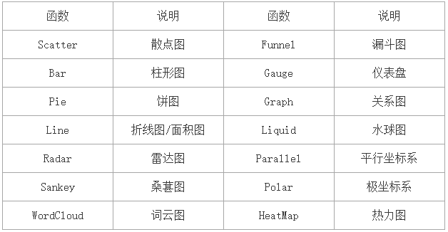 注意:这里我们只列出了部分图形,包括我们后面绘制地图,也都是在pyecharts的子模块charts模块下,我们要记住这句导入相关图形库的代码。