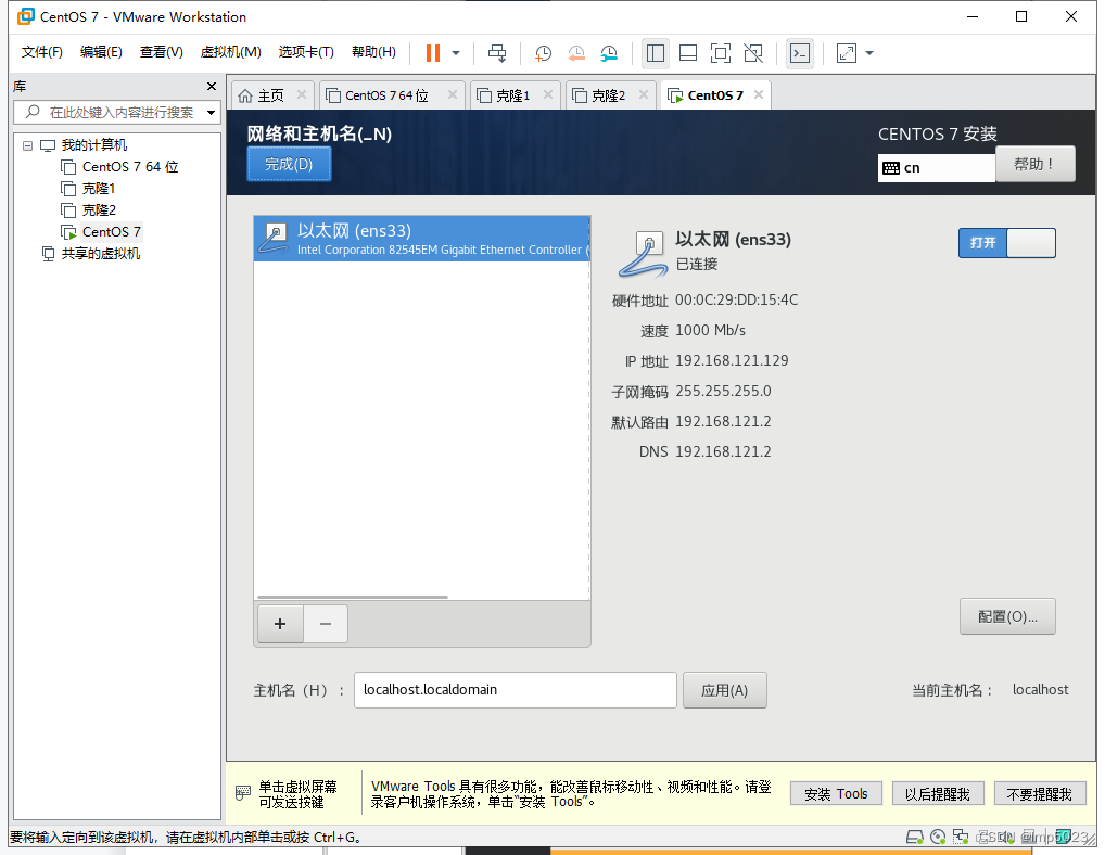 第二个地址是192.168.121.129,就是刚刚自动获取的IP地址,其中ens33是网卡的名字。
