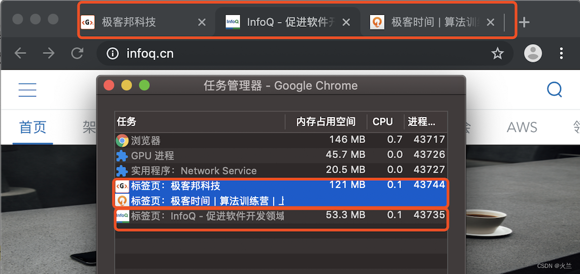 从图中任务管理器可以看出:由于极客邦和极客时间的标签页拥有相同的协议和根域名,所以它们属于同一站点,并运行在同一个渲染进程中;而 infoq.cn 的根域名不同于 geekbang.org,也就是说 InfoQ 和极客邦不属于同一站点,因此它们会运行在两个不同的渲染进程之中。