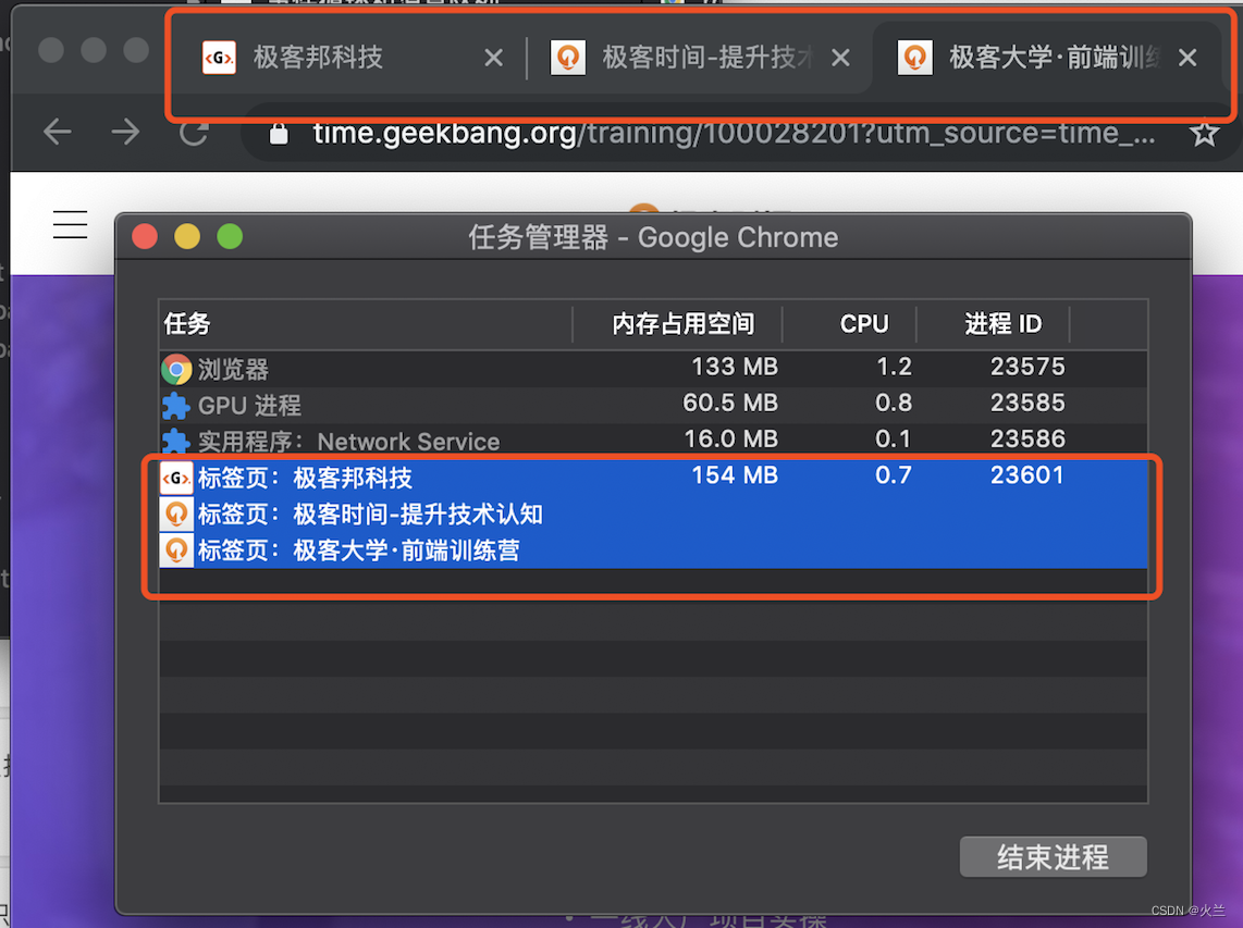 比如我从极客时间的首页里面打开了另外一个页面——算法训练营,我们看下图的 Chrome 的任务管理器截图: