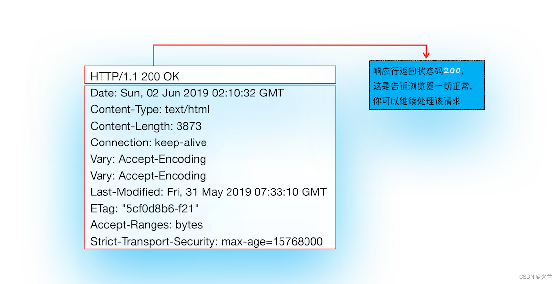 从图中可以看出,服务器返回的响应头的状态码是 200,这是告诉浏览器一切正常,可以继续往下处理该请求了。