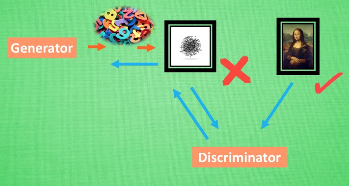 (自己理解:首先将该网络分成两个模块--Generator和Discriminator,其中G是产生我们所需目标的角色,而D则是通过我们直接训练造就的指导者。我们通过表示正样本和负样本或者说不断修改D所判别的结果使其符合我们预期,慢慢的D会形成一套自己的成熟网络体系。此时,D将这套网络体系传授给G,那么G可以明白自己要产生的产品是是什么样的,并不断优化成熟。)