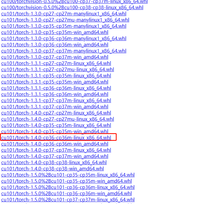 cu为GPU版本,101是cuda版本号,0.5.0的torchvision,对应自己的Python3.6 版本。