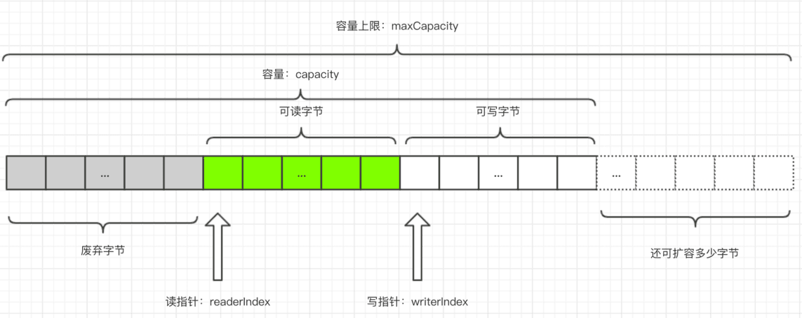- ByteBuf 里面其实还有一个参数 maxCapacity,当向 ByteBuf 写数据的时候,如果容量不足,那么这个时候可以进行扩容,直到 capacity 扩容到 maxCapacity,超过 maxCapacity 就会报错