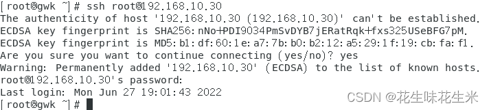 通过ssh root@192.168.10.30测试连通性