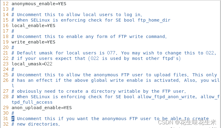 29 anon_upload_enable=YES 允许匿名用户上传文件。默认已注释,需要取消注释