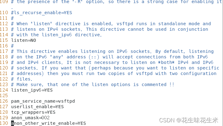 130 anon_other_write_enable=YES 允许其他删除、重命名、覆盖等操作。需要添加