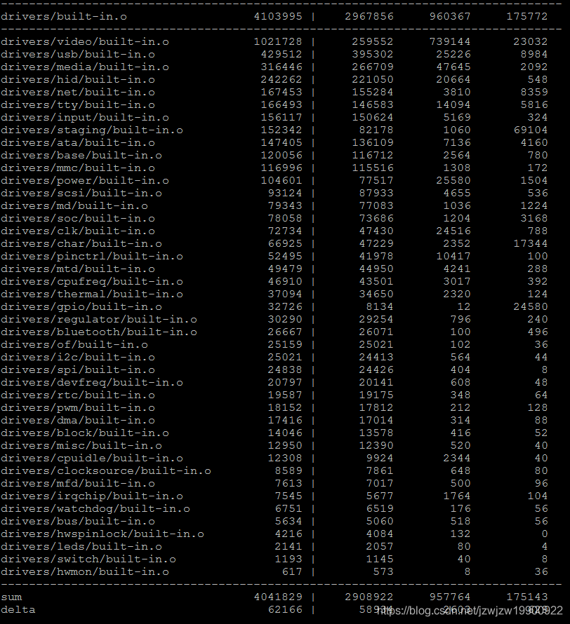 从上面,我们可以看出Driver里有具体哪个built-in.o,每个built-in.o具体的大小,