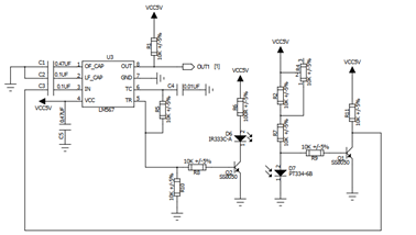 发射电路:白色管为发射电路,VCC供电,经过限流电阻,给发射管供电,限流电阻决定了供电电流的大小,根据发射管规格书,电流越大发射功率越强。
