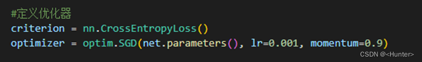 optimizer = optim.SGD(net.parameters(), lr=0.001, momentum=0.9)