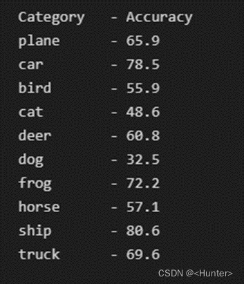 classes = ('plane', 'car', 'bird', 'cat', 'deer', 'dog', 'frog', 'horse', 'ship', 'truck')