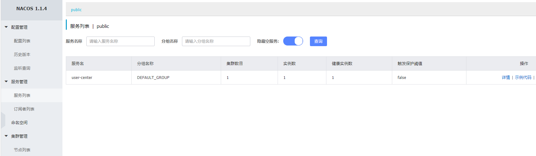 4、访问 http://localhost:8848/nacos/#/login,默认情况用户名密码都是nacos,进入控制台查看服务列表