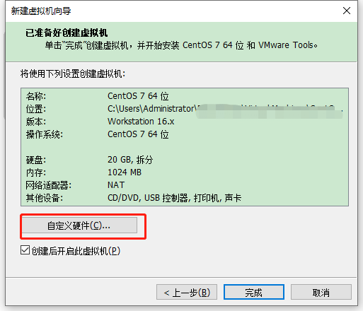 6.可以点击自定义硬件编辑一些虚拟机内存等配置,修改完成后点击完成即可