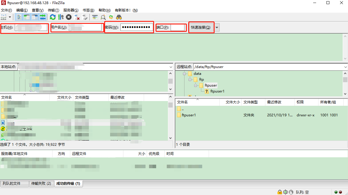 1.打开filezilla输入主机(ip地址)、用户名、密码、端口号(默认21)即可连接