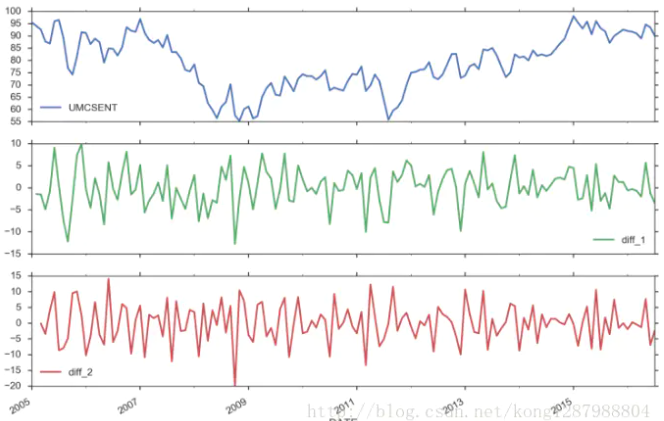 举个例子,当序列不*稳时,需要通过差分使时间序列变*稳,如下图所示,第一张图是原始数据,第二张图是一阶差分,第三张图是二阶差分: