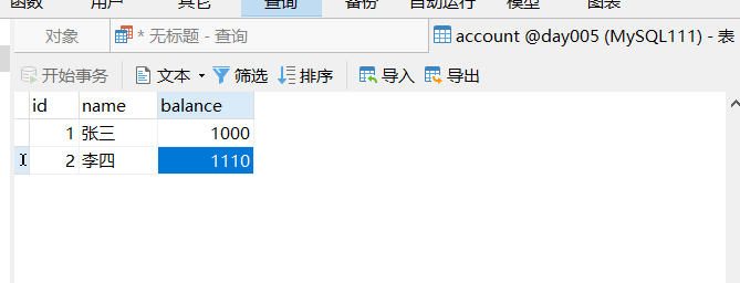 insert into account values(null,'张三',1000),(null,'李四',1110);