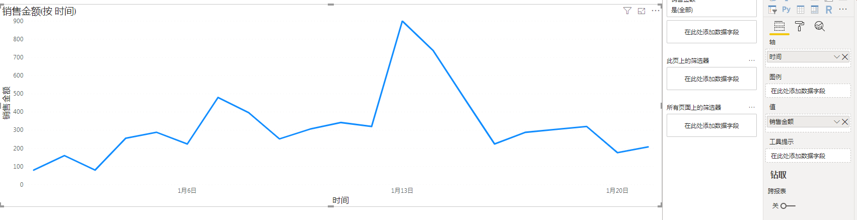 老规矩,建立日期表,建立模型关系,这里就不赘述了。现将原始数据放入折线图中查看。结果如下: