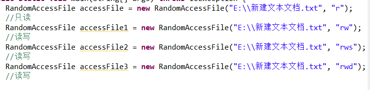 RandomAccessFile类有四种访问模式,这是和其他的输入/输出流不一样的地方,在实例的时候,构造器需要传入两个参数,第一个参数和其他的输入/输出流一样,是要操作的文件的路径,第二个参数是指定访问的模式,
