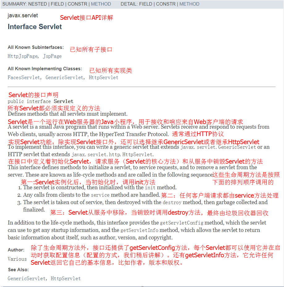 - 实现Servlet接口,接口中的方法必须全部实现。