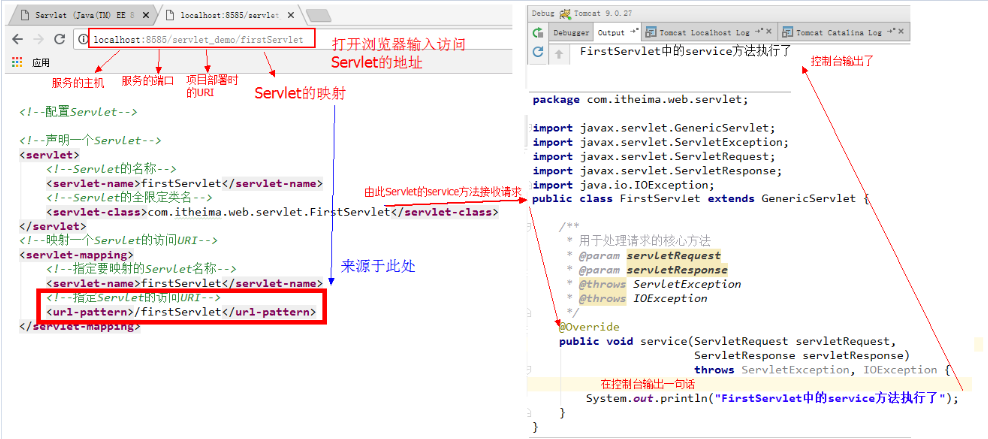 - 浏览器——>Tomcat服务器——>我们的应用——>应用中的web.xml——>FirstServlet——>响应浏览器